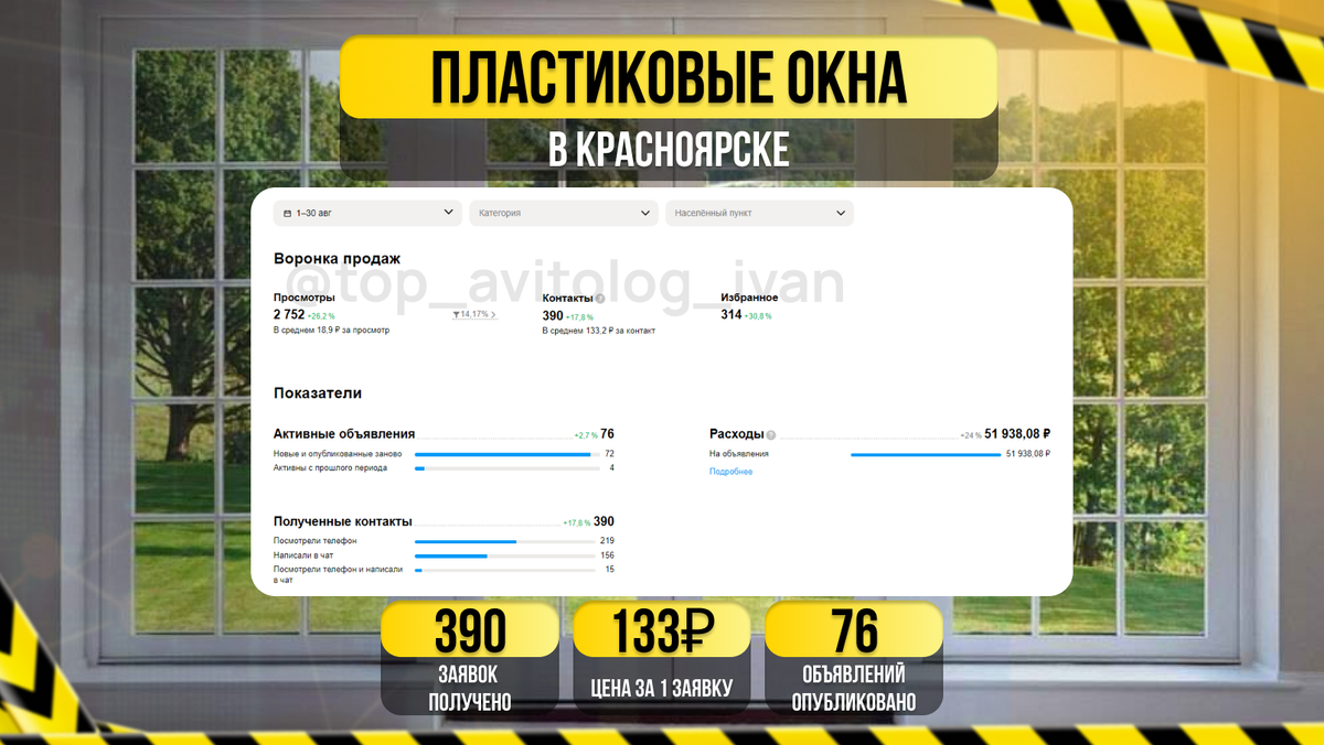 🔥 390 заявок в месяц с Авито на пластиковые окна. Цена за лид: 133 рубля. Эффективное продвижение на Avito.