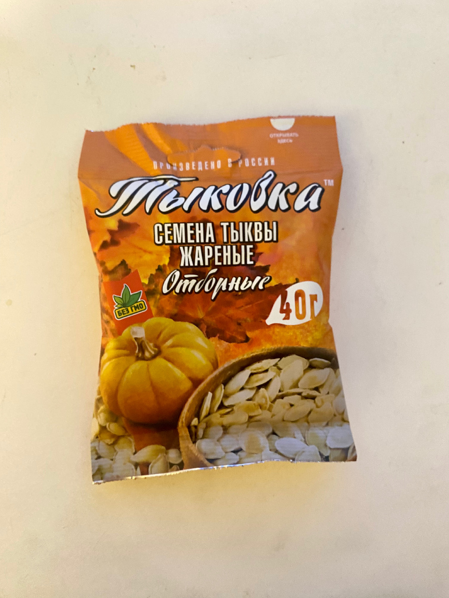 Привет, друзья! Совсем недавно я приобрел тыквенные семечки в магазине "Красное Белое" по рекомендации коллеги с работы. Ранее я покупал только подсолнечные семечки в развес на местном рынке и не помнил, когда последний раз пробовал тыквенные семечки. Однако, попробовав семечки из магазина, я обнаружил неожиданное разнообразие . Обзор пишу о тыквенных семечках - Тыковка. Упаковка привлекательная, яркая, вес 40 грамм - стоит 37 рублей. На обратной стороне информация о составе, производителя, сроке годности, калорийности - на 100 гр 600 ккал (в жареных, в сырых 560 ккал). Многие могут испугаться их калорийности и отказаться от продукта. Но напрасно , ведь они вмещают дневную порцию цинка. Полезные свойства 👇 Семечки повышают иммунитет, борются с кишечными паразитами, помогают при воспалении суставов, остеопорозе, волосы становятся красивее, а коже дольше сохраняет молодость. Но у нас к сожалению они не очень популярны. Все привыкли есть семена подсолнечника, наверно поточу что их удоб