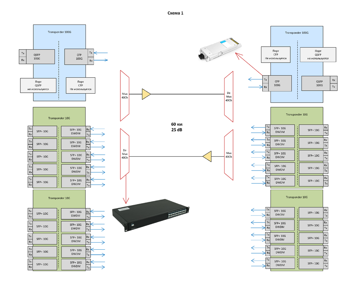 Сократить расходы и увеличить эффективность использования оптических каналов. Рассмотрим классическую схему сети, использующую 10G-каналы. В текущей конфигурации 10 отдельных каналов занимают место на мультиплексоре, что значительно снижает гибкость и увеличивает стоимость эксплуатации. Мы предлагаем апгрейд, который позволит сэкономить 10 каналов на мультиплексоре, используя современные технологии. На первой схеме изображена изначальная работающая сеть, состоящая из 10 отдельных каналов по 10G каждый. Каждый из этих каналов занимает отдельный порт на мультиплексоре, что требует значительных ресурсов и создает определенные ограничения в масштабировании сети. Стоимость и энергопотребление наращиваются с каждым новым каналом, а емкость сети ограничена возможностями мультиплексора. На втором рисунке показана сеть после внедрения решения с мукспондером. Вместо использования 10 отдельных каналов по 10G, предлагается использовать мукспондер 100G + 10x10G, который преобразует 10 отдельных кан