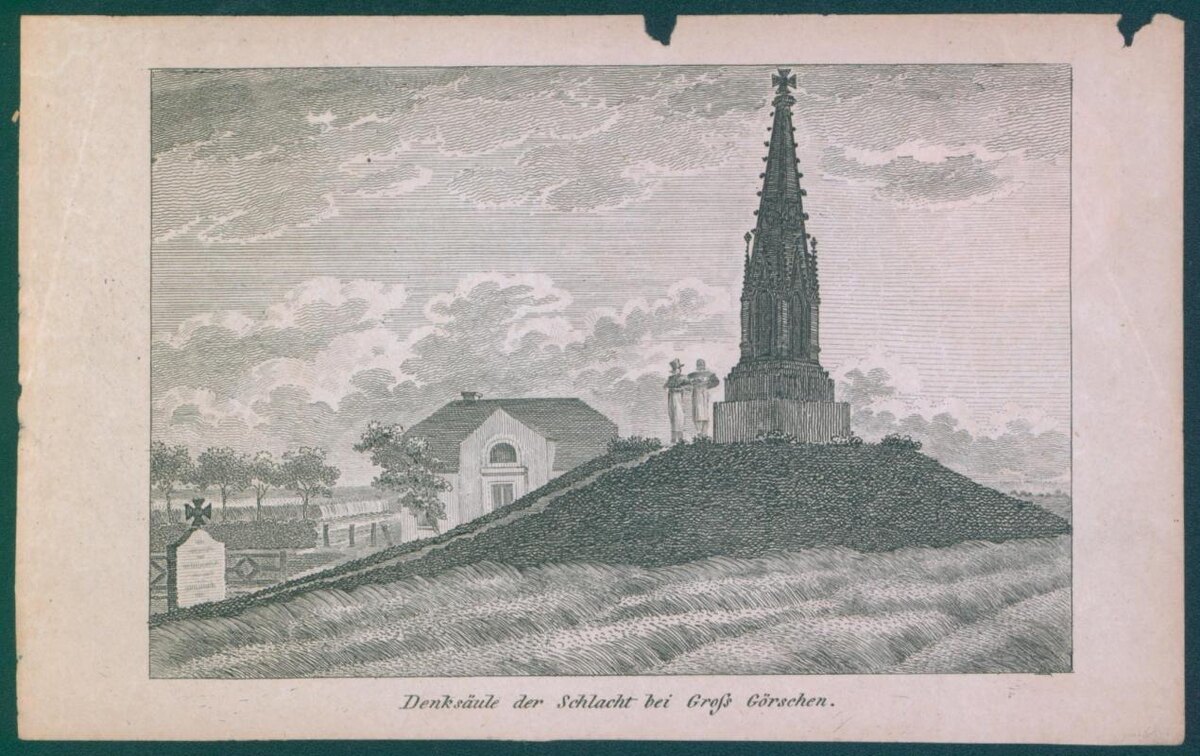 Хронологически первым из сражений Заграничного похода, увековеченных в 1817-1818 годах монументами по проекту К.Ф.Шинкеля, стала битва при Лютцене 2 мая 1813 года. При этом, если русские и французские исследователи определяют её по городу, находившемуся ближе всего к полю битвы, то в немецкой традиции она известна как сражение при Гроссгёршене по деревне, оказавшейся непосредственно в эпицентре боя. В ходе боевых действий в Германии весной 1813 года союзные русско-прусские войска смогли не только очистить от неприятеля территорию Пруссии, но и занять часть Саксонии, опираясь в качестве тыла на течение реки Эльба. В то же время Наполеону удалось собрать во Франции новую обширную армию и, несмотря на недостаток кавалерии и артиллерии, также двинуться в Саксонию. Контроль над Саксонией, король которой колебался, не решаясь примкнуть ни к одной из армий, был особенно важен для обеих сторон, поскольку её оккупация Францией ставила бы под угрозу прусскую столицу – Берлин и нарушала операцион