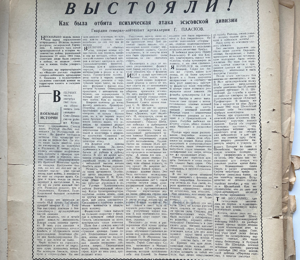 Сегодня мы перепечатываем из «Недели» рассказ гвардии генерал-лейтенанта артиллерии Г. Пласкова о мужественном сражении советских воинов на территории нашего и соседних районов.
