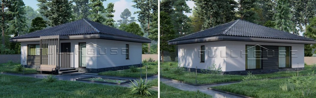 В домах с квадратным планом можно проектировать шатровые крыши: смотрятся они очень эстетично, и тоже позволяют получать определённую экономию. Достоинством всех вальмовых крыш является то, что для их устройства не требуется возводить фронтоны – а это экономит не только кладочный материал, но и металл с бетоном и пиломатериал, необходимые для устройства наклонного армопояса. По желанию заказчика стропильная система крыши может собираться из бруса и доски, но проектом предусмотрено использование деревянных ферм заводской готовности. Их применение позволяет сокращать сроки заведения дома под крышу, и благодаря отменному качеству дерева и высокоточной заводской сборке узлов, обеспечивает ей более высокую прочность и ветроустойчивость. Кровельное покрытие металлочерепичное, внешняя отделка дома выполняется белой штукатуркой, комбинируемой с фиброцементными панелями под дерево.