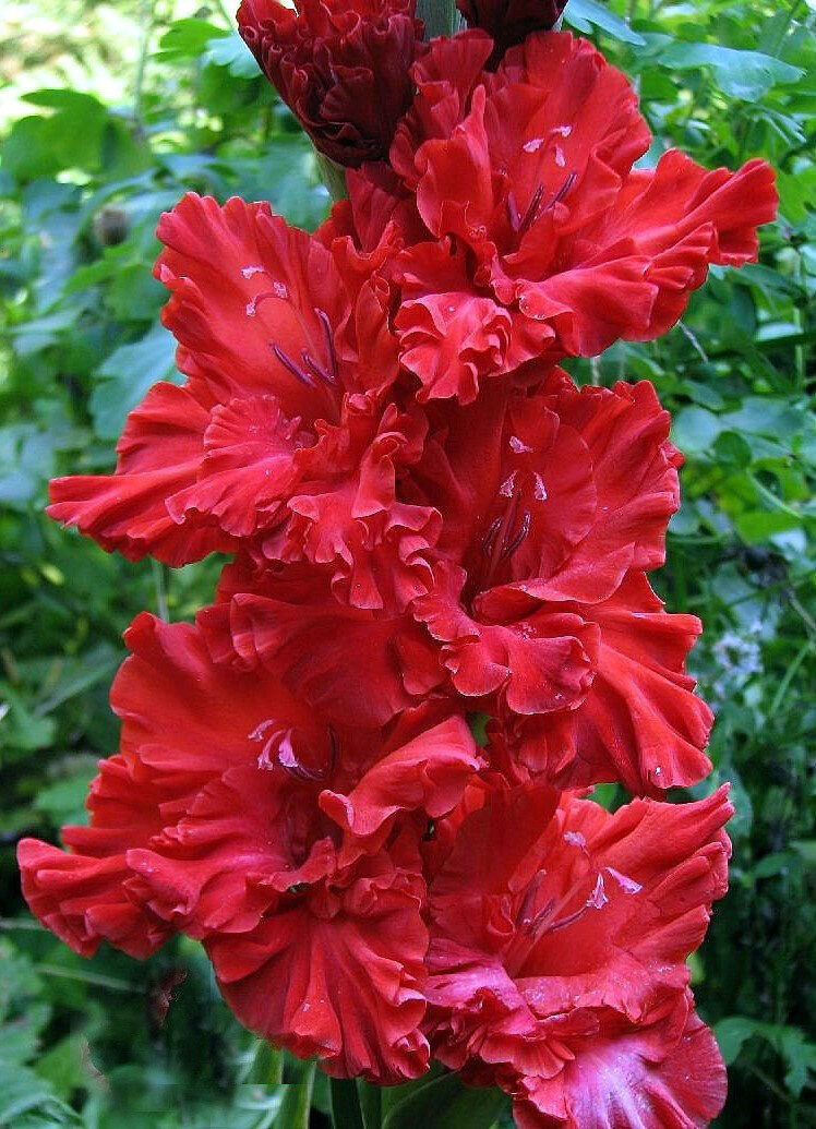 Всего в мире насчитывается около 5 тысяч сортов гладиолусов. На упаковках с луковицами гладиолусов пишут цифровые обозначения. Первая цифра кода (от 1 до 6) обозначает размер цветков: 1 – миниатюрные, 2 – мелкие, 3 – средние, 4 – крупные, 5 – гигантские, 6 – окружностные.