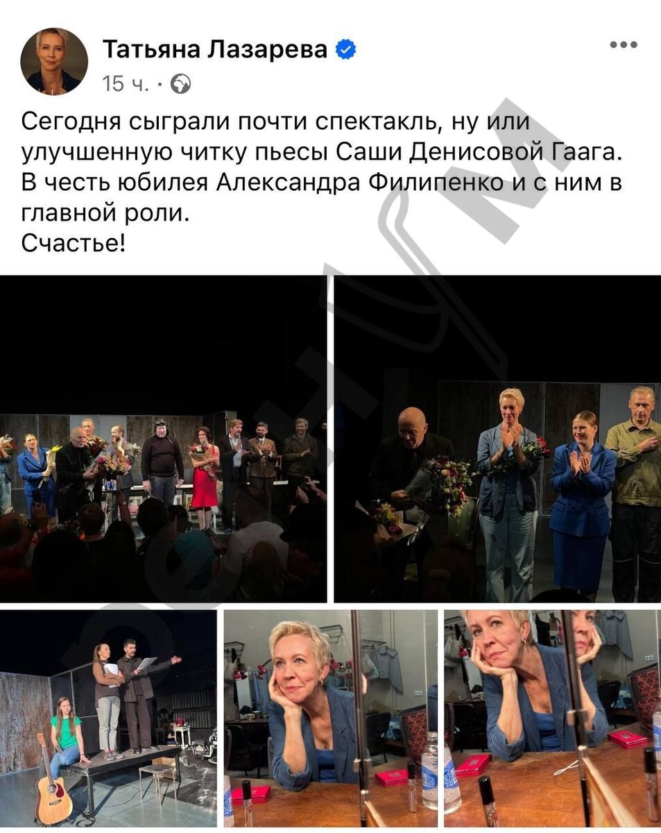 Иноагент Татьяна Лазарева опубликовала у себя на странице в сети имени марка Цуккерберга фотографии с читки спектакля "Гаага", в котором приняла участие на пару со ставшим русофобом Филиппенко и проукраинкой, ныне живущей в Аргентине- Варварой Шмыковой.