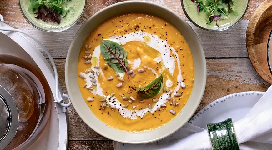Не знаете, как подступиться к батату? Попробуйте приготовить из него крем-суп. С картошкой этот корнеплод сравнивают часто, но будем откровенны — вкус у него совсем другой. Намного слаще и выразительнее. А какой он дает цвет нежному овощному блюду! Ценится батат за высокое содержание клетчатки и кальция, в нем сравнительно много сахара и крахмала, но при этом диабетикам продукт, в отличие от картофеля и риса, рекомендован. Бульон для супа можно приготовить овощной, сварив в кастрюле ароматный букет из моркови, лука и сельдерея. Украшают блюдо так же, как похожее из тыквы — семечками и сливками. Этот нехитрый прием также поможет усвоению витамина A. ПОШАГОВЫЙ РЕЦЕПТ #батат #супы #осенниеблюда