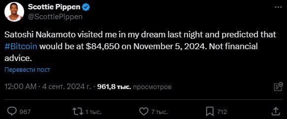 Баскетболист NBA Скотти Пиппен утверждает , что во сне его посетил Caтоши Накамото и предсказал точную цену BTC на 5 ноября 2024 – $84 650.Ну хоть какие-то хорошие новости на сегодня 😐