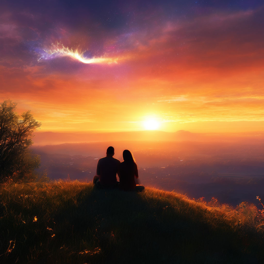 любещея пара седят и смотрят на закат и на скорый конец