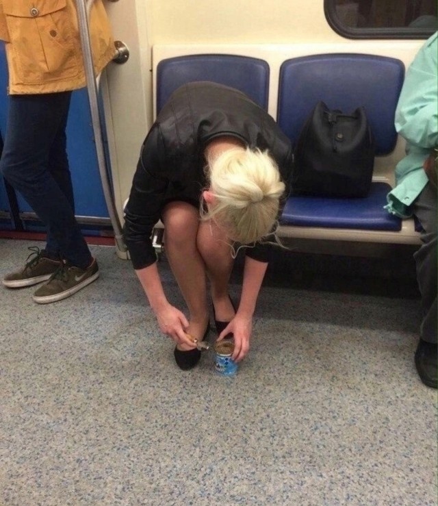 В метро как происходили смешные и нелепые ситуации, так и происходят. При чем это касается не только российского метро, но и зарубежного. За рубежом в метро тоже происходит много забавных ситуаций. А чтобы вам скучно не было, мы подобрали очередную подборку забавных фотографий из метро. Еще одна подборка забавных фотографий из метро 1. Не зря же говорят, что Голод не тетка, пирожка не поднесет. Складывается такое ощущение, что эта женщина уже не первый раз трапезничает в общественном транспорте. Потому что ведь не у каждого пассажира метро в сумке окажется банка сгущенки и открывалка для нее. 2. Зачем ездить на своем автомобиле или на такси, если в метро передвигаться гораздо комфортнее? Правда там бывает людно и не всегда получается с таким комфортом ездить. Но судя по всему иногда так получается, иначе бы таких фотографий не было. 3. Вот еще один человек в метро, которому очень комфортно. По любому, он себя ощущает, как дома. Раз благоустройство никак не может добраться до метро. Т