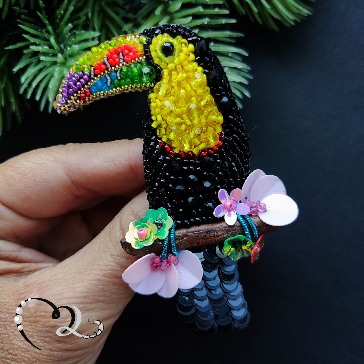 Тукан считается символом богатства и процветания. Его яркие цвета и великолепное оперение ассоциируются с изобилием и благополучием. Тукан также считается символом защиты и удачи. Его длинный и крепкий клюв считается символом силы и защиты от негативной энергии. ▪️ фетр жесткий толщиной 1 мм (белый), ▪️ акриловые краски, ▪️ бисер чешский № 10 (чёрный, красный "огонёк, жёлто-лимонный), ▪️ бисер японский №15 (салатовый, бордовый, красный, фиолетовый, голубой, зелёный, чёрный), ▪️ полимерная глина, ▪️ рондели 3х4 мм (жёлтого и чёрного цветов), ▪️ бусинка 3 мм (чёрного цвета для глаза), ▪️ канитель жесткая (золотистая и голубая), ▪️ пайетки 3 и 4 мм (чёрные) - для хвоста, ▪️ пайетки "цветочки", ▪️ пайетки 2 мм (чёрные и золотистые) - для обшивки края, ▪️ пайетки 10 мм (розовые со смещённым центром), ▪️ основы для броши 30 и 25 мм, ▪️ нитки капроновы