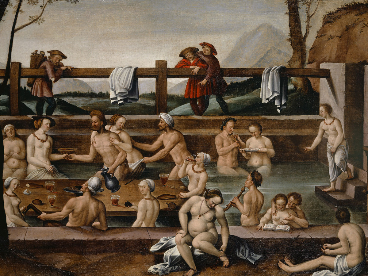 Эротические фантазии вокруг купания берут начало в средневековом представлении о теле, отмеченном античной гуморальной теорией. Согласно этой теории, тело со всеми его отверстиями и выделениями представлялось как пористый организм, проницаемый для всех форм жидкостей. Эта «текучесть» тела привела к практике, когда люди сидели в термальных водах до восьми часов подряд. И купальщики Ганса Бока сидят в воде вокруг стола, читают, музицируют, выпивают, флиртуют…чтобы не скучать. В банях 15 и 16 веков присутствие музыкантов, подбадривающих купальщиков, – распространённая практика.