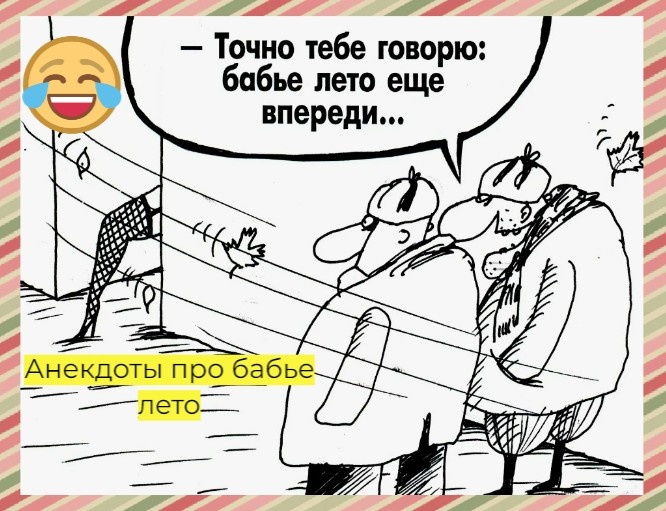 "Бабье лето" - это короткий, но очень теплый и приятный период осени, когда природа словно дарит нам последние солнечные деньки перед холодами. И, конечно же, вокруг этого времени года тоже накопилось немало смешных историй и забавных ситуаций. Предлагаем вашему вниманию подборку самых ржачных анекдотов про "бабье лето"!