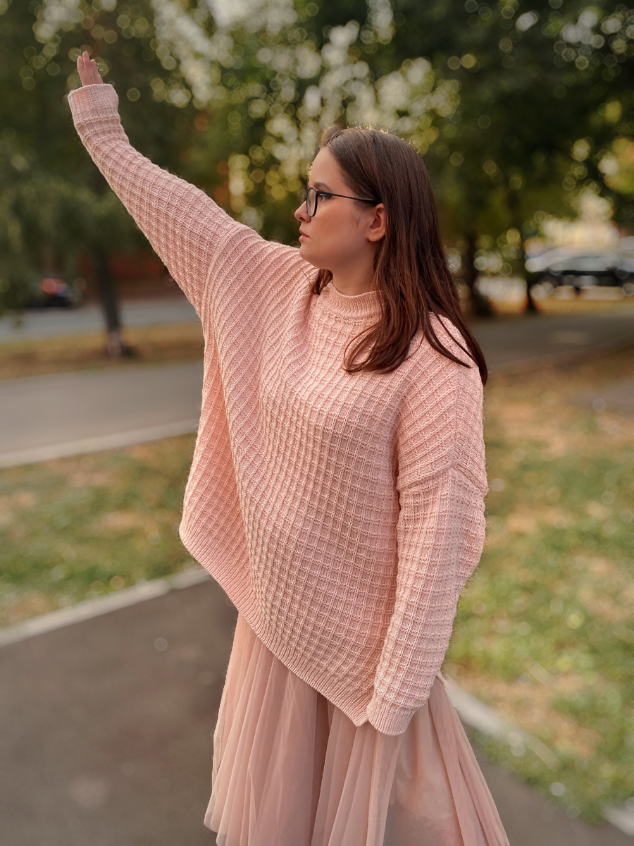 Мы с вами уже много раз говорили о необходимости вывязывать скос плеча и окат рукава в вязаных изделиях. Без скоса и оката мы получаем прямоугольник, который собирается складками в области подмышки. Многие считают, что ничего критичного в этом нет. Переубеждать никого не буду - нравится так вязать, удобно так носить - дело хозяйское. А для тех, кому все-таки важно "посадить" изделие так, как нужно, я и пишу свои статьи. Хотите - пробуйте, понравится - вяжите и носите с удовольствием! Сегодня поговорим о двух вариантах вывязывания рукава в моделях со спущенной линией плеча. Я нечасто вяжу сшивные изделия со спущенным плечом. Но фотографию к сегодняшней статье в своих закромах нашла. Здесь на Даше джемпер оверсайз, который я вязала не для нее, Даше он велик. В этом случае я использовала первый способ вязания спущенного плеча - прямая пройма и вывязывание оката рукава. Есть еще один вариант - пройма с прибавками и рукав без оката. Что едино в этих двух случаях? Нам обязательно нужно пр