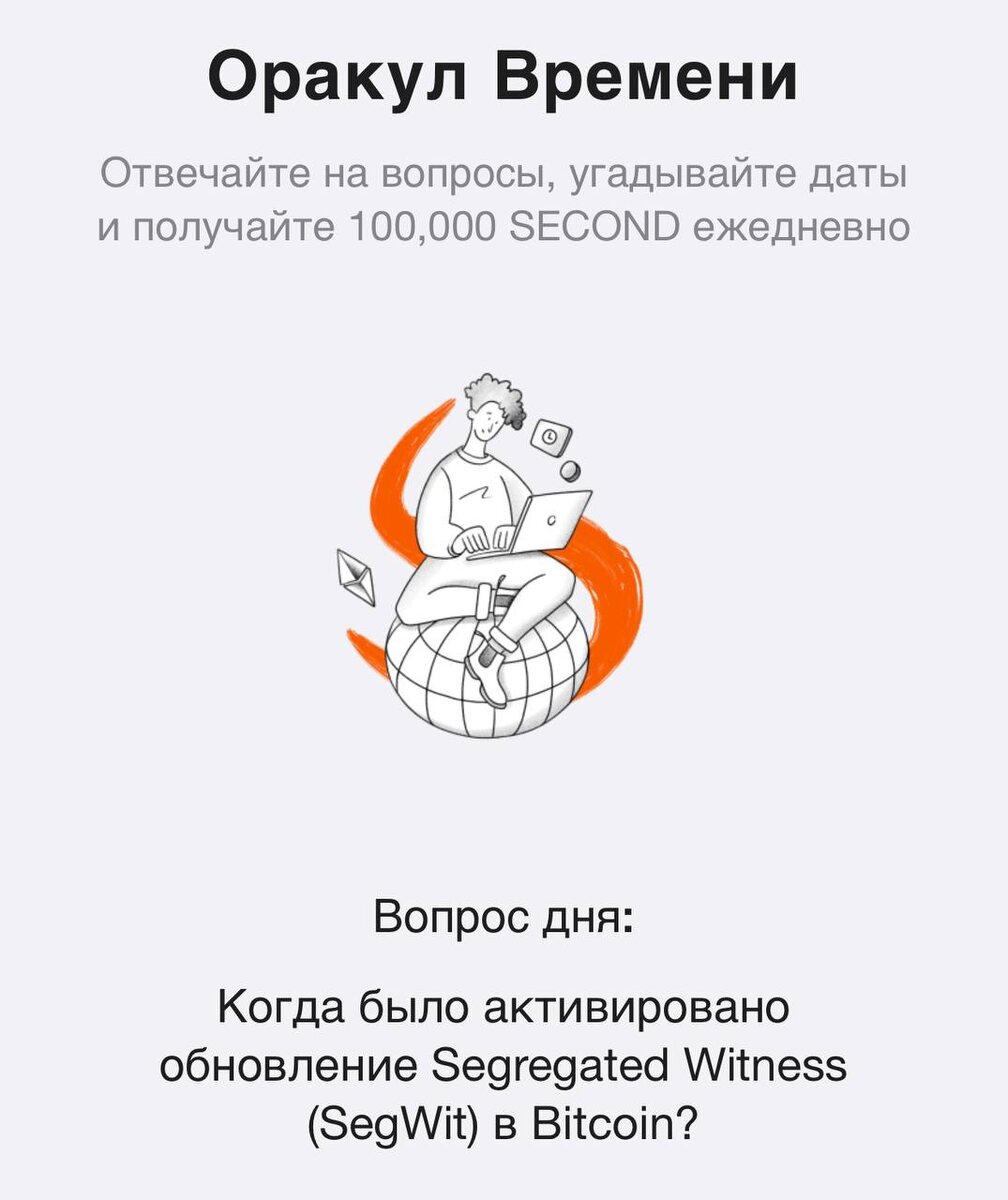 Time Farm Oracle загадка от 05.09.2024 Когда было активировано обновление Segregated Witness (SegWit) в Bitcoin? Ответ: 24.08.2017 Подпишись в телеграмм канал, чтобы следить за новостями проектов