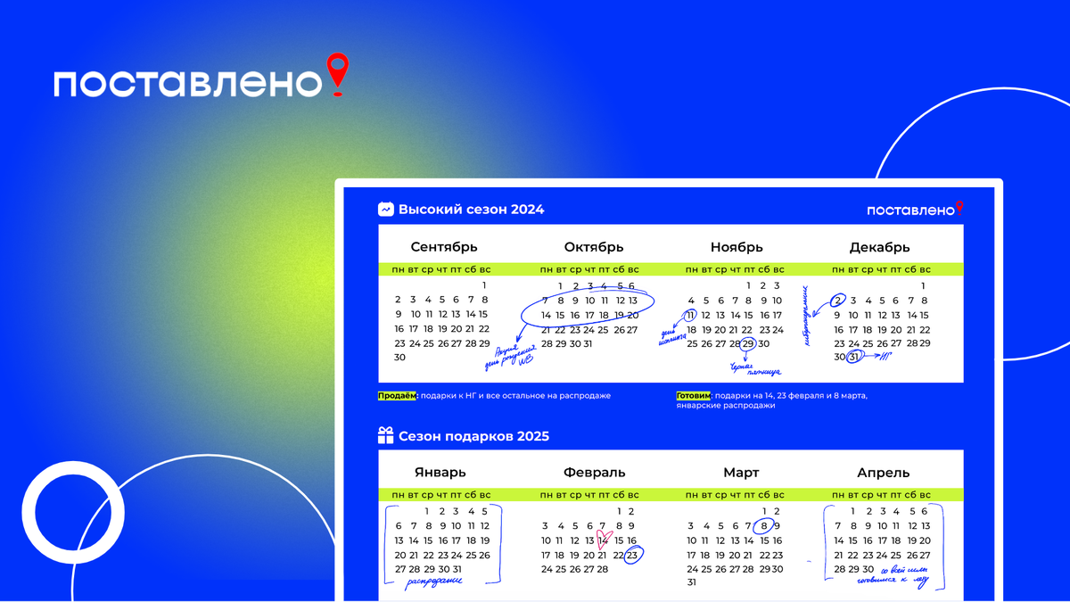 Календарь селлера немного отличается от обывательского. Пока все наслаждаются майскими, селлеры закупаются к осени, а осенью вовсю думают про грядущие 23 февраля и 8 марта. В общем, планировать поставки и закупать товар нужно сильно заранее. В конце статьи – подарок: бесплатный календарь для селлеров на 2024-2025 год, который можно распечатать! Во, первых, важно понимать, когда готовиться к сезону. Если покупатели начинают искать подарки за месяц до праздника, то со стороны селлеров работа начинается намного раньше. В общем, у продуманных селлеров работа сдвигается на сезон, а то и на два назад. Все активности на разных площадках похожи – никто не хочет терять клиентов в момент, когда конкуренты делают скидки и привлекают внимание. Люди уже привыкли к бесконечным Чёрным Пятницам и сезонным распродажам, поэтому стабильно ждут этого от маркетплейсов. Даты проведения акций плюс-минус одинаковые, но каждая площадка стремится обогнать другую. Wildberries уже анонсировали даты грядущих акци