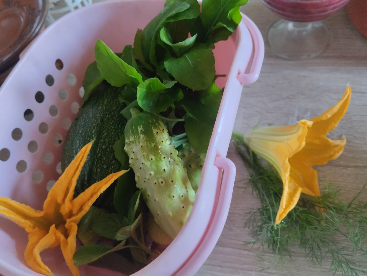 Сорвала кабачок-зеленец, несколько огурчиков, зелень.