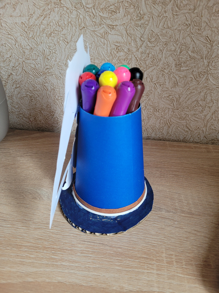 Чтобы подставка была устойчивой, мы переворачиваем стакан и вырезаем дно. В качестве основы можно взять толстый картон. У нас был кусок от коробки в виде круга, сын раскрасил его синим фломастером, а затем про помощи клеевого пистолета прикрепил стаканчик к основе: