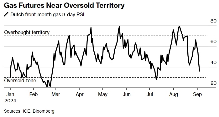 Голландские фьючерсы раскачиваются после потери более 10% ранее на этой неделе. Девятидневный индекс относительной силы сигнализирует об изменении настроений После трех дней снижения европейский природный газ оказался на территории перепроданности, поскольку опасения по поводу ближайших поставок ослабли. Фьючерсы на газ стабилизировались в четверг после потери более 10% в начале недели, что привело к снижению до одномесячного минимума. Девятидневный индекс относительной силы (RSI) упал ниже 36 в начале торгов до уровня, который в последний раз наблюдался в июле. Обычно значение 30 или ниже указывает на возможный разворот рынка, поскольку продажи, возможно, были чрезмерными. Однако в прежние времена европейский газ оставался на территории перепроданности в течение нескольких дней. Изменение настроений произошло после того, как в прошлом месяце цены на газ взлетели до максимума 2024 года, вызванного опасениями, что активизация боевых действий между Россией и Украиной, а также продолжител