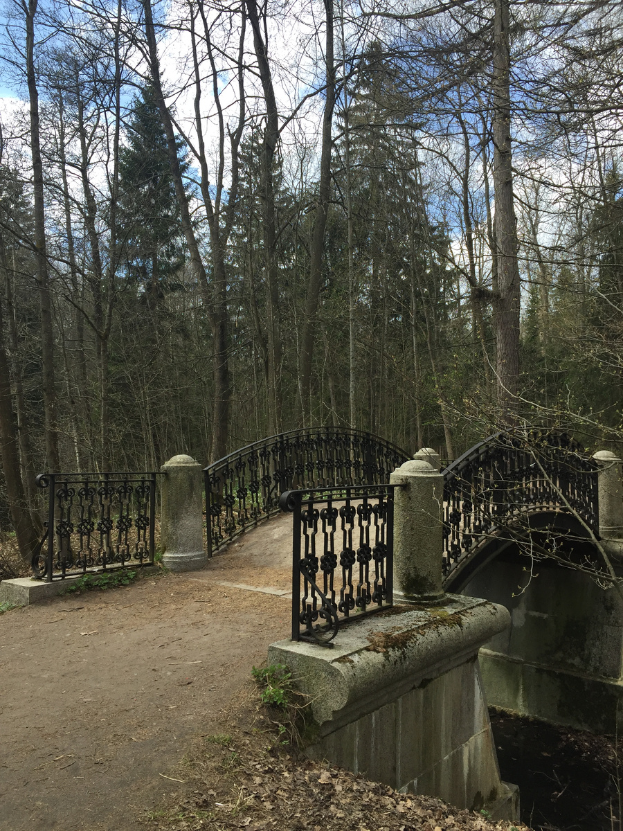 В один из будней поехали мы с Фенимором голову смотреть. В этот парк все за этим и ездят. Сергиевка – место хоть и красивое, но больше там делать особенно нечего. В скромный дворец не пускают, чайный домик разрушен, капелла в руинах. Разве что мосты-плотины интересные, но это на любителя. Доехать можно до станции "Университетская", а там прямо от железнодорожной платформы дорога, прямая, как стрела, ведёт в лес. Это и есть парк Сергиевка. Если упрощённо, то это имение одной из дочерей Николая I и её супруга. Но о них тут ничего уже не напоминает. Интересно, что парк хорош и в пасмурную погоду. Я бы даже сказала, именно в хмурый день он интереснее – атмосфернее, что ли, мрачнее. Готичнее. Черные острия елей, валуны, кованые ограды моста над темной водой, плотины разваленные, какие-то руины, тропы. Корни из-под земли торчат. Хоть садись и балладу пиши. В Павловском парке деревья специально высаживали с учётом того, какие и как цвет меняют по осени – чтобы создать красочный пейзаж – а
