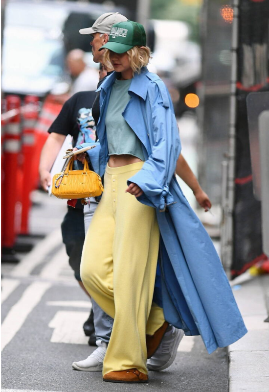 Мы обожаем стритстайл Джиджи Хадид. Модель следит за всеми новыми трендами и оперативно внедряет их в аутфиты, рифмуя с собственным вкусом и чувством стиля. В итоге образы получаются по-настоящему модными и актуальными. Например, недавно девушка засветилась на прогулке по Нью-Йорку. Джиджи выбрала уютные светло-желтые штаны на низкой посадке, дополнила их голубой укороченной футболкой, сверху накинула макси-тренч в тон. Завершили комбинацию насыщено-зеленая кепка, горчичная сумка-такса и замшевая обувь. Получилось очень яркое сочетание, но при этом гармоничное и сбалансированное. Минимализм и луки в нейтральных оттенках уже порядком надоели, осень — самое подходящее время, чтобы добавить красок. Особенно нас привлек тренч. Нежный, но в то же время насыщенно-голубой оттенок освежил образ, сделав его эффектнее и интереснее. Верхняя одежда в таком цвете — отличная альтернатива бежевым, белым, коричневым и черным моделям. Светло-синий также впишется в любой гардероб и станет классным акцен
