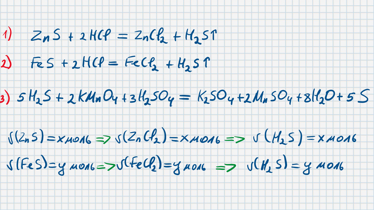 Смесь сульфидов цинка и железа(II) растворили в избытке соляной кислоты, получив раствор, в котором массовая доля соли цинка в 3,21 раза больше массовой доли второй соли. Выделившийся при растворении газ прореагировал в сернокислотной среде точно с 100 мл раствора перманганата калия, концентрация которого 0,16 моль/л. Рассчитайте массовую долю сульфида цинка в исходной смеси сульфидов металлов. В ответе запишите уравнения реакций, которые указаны в условии задачи, и приведите все необходимые вычисления (указывайте единицы измерения искомых физических величин). Напишем уравнения химических реакций. При взаимодействии и сульфида цинка и сульфида железа (II) выделяется сероводород в виде газа. Сероводород с подкисленным перманганатом калия вступает в окислительно-восстановительную реакцию. Для решения задачи необходимо определить количество вещества сероводорода. Для этого определяем количество вещества перманганата калия через концентрацию. После, по соотношению рассчитываем коли