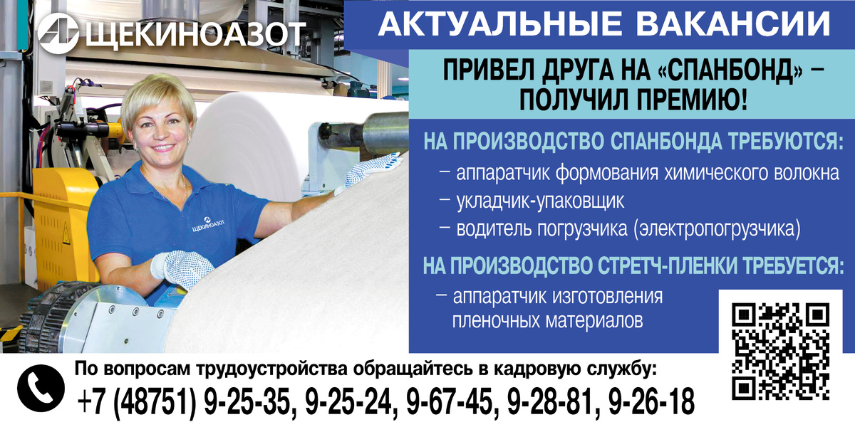 Вниманию работников АО «Щекиноазот» и Первомайского филиала! У вас есть возможность участвовать в акции «Приведи друга на работу». Приглашайте своих друзей на работу в Первомайский филиал и получайте БОНУС в размере 15 000 рублей за каждого нового приглашенного работника. Кстати, актуальные вакансии в Первомайском филиале: Производство Спанбонда: – аппаратчик формования химического волокна – укладчик-упаковщик – водитель погрузчика (электропогрузчика) Производство Стретч-пленки: – аппаратчик изготовления пленочных материалов Все актуальные вакансии на предприятии – здесь: http://n-azot.ru/vacancy.php. По вопросам трудоустройства обращайтесь в кадровую службу. Контактные телефоны: +7 (48751) 9-25-35, 9-25-24, 9-67-45, 9-28-81, 9-26-18.