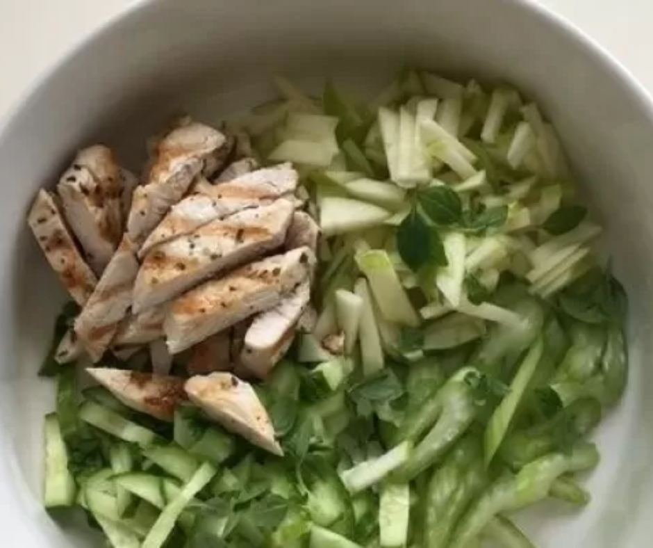 Огурец, сельдерей, авокадо и половину яблока нарезать соломкой.