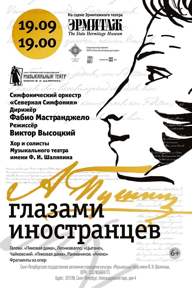 Музыкальный театр им.Ф.И.Шаляпина совместно с Некоммерческим партнёрством. «Искусство XXI век» представляют уникальный проект «Пушкин глазами иностранцев». Проект реализован при поддержке Комитета по культуре Санкт-Петербурга. Соорганизатор - ООГО «Российский фонд культуры». Проект состоится 19 сентября в 19.00 на сцене Эрмитажного театра при участии симфонического оркестра Музыкального театра им.Ф.И.Шаляпина «Северная Симфония» под управлением маэстро Фабио Мастранджело. В проекте примут участие хор и солисты Музыкального театра им.Ф.И.Шаляпина, а также солистка Мариинского театра Цветана Омельчук и приглашенный солист Мариинского театра Роман Арндт. Режиссер - Виктор Высоцкий. Божественное начало в человеке особенно ярко проявляется в творчестве великих людей. В России оно отразилось в произведениях Александра Сергеевича Пушкина, ставших неотъемлемой частью нашего языка, мировоззрения и образа мыслей. Пушкин быс