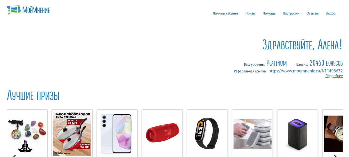Сайт МоеМнение мне нравится потому что на нём больше всего опросов, по будням приходит по несколько опросов в день - от трёх до пяти в среднем. По выходным опросов нет или очень мало. Этот сайт платит не деньгами, а баллами, которые можно обменять на призы, представленные на сайте. Товаров этих много - от ручки и заколки для волос до телевизора и айфона, такой мини интернет-магазин.