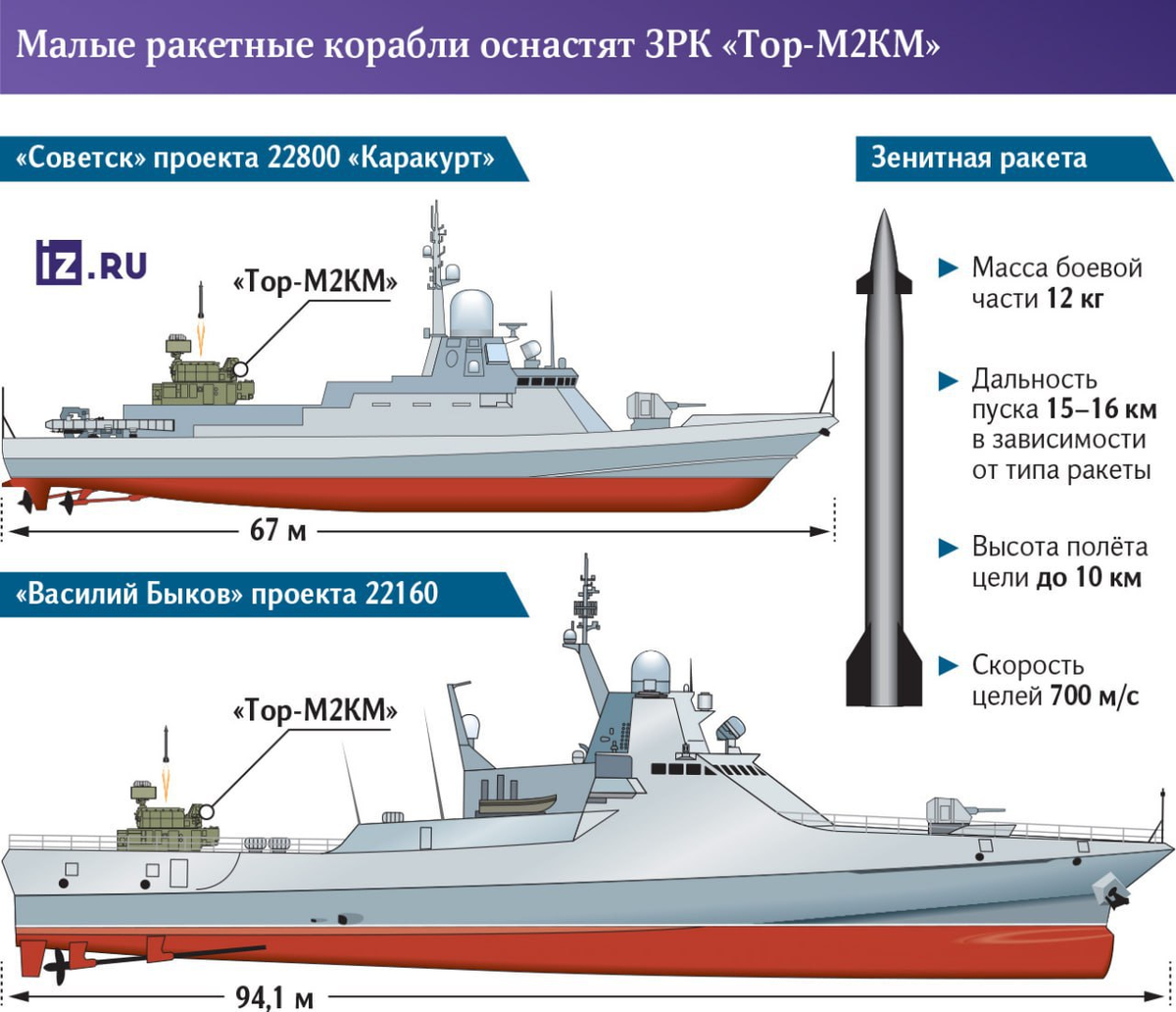 Малые ракетные и патрульные корабли ВМФ РФ уже получают зенитно-ракетный комплекс «Тор-М2КМ». В частности, они уже были установлены на малом ракетном корабле «Советск» проекта 22800 «Каракурт» и патрульном «Василий Быков», проекта 22160. В дальнейшим ЗРК оборудуют и другие боевые единицы этих и других типов кораблей, рассказали источники «Известий» в ВМФ РФ.
