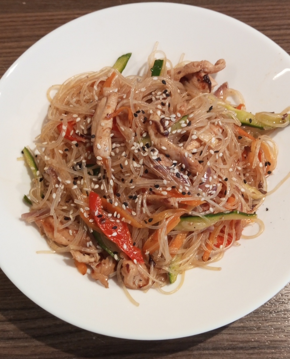 Всем добрый день! Меня зовут Вера, мне 39 лет, недавно я стала мамой второй раз, скидываю лишнее после беременности и родов, начальный вес 75, а здесь я рассказываю о том, как Я: - худею КАК Я ХОЧУ, - готовлю КАК Я ХОЧУ, - занимаюсь спортом КАК Я ХОЧУ, - живу КАК Я ХОЧУ) Звучит эгоистично 😀, но зато честно. Сегодня предлагаю вашему вниманию блюдо, от которого вы точно не поправитесь), приготовим одно из любимых блюд моей семьи. Готовить просто и быстро, но почему-то то, я не часто его делаю и это фунчоза с овощами и мясом или овощи с мясом и фунчозой так правильнее😀, если поменять пропорции блюдо становится максимально сбалансированным. Уменьшите количество лапши, увеличьте количество овощей и мяса, сократите время температурной обработки для овощей и вуаля... идеальное блюдо для худеющих готово! Фунчоза, это лапша из зеленых бобов мунг (маш) она богата витаминами группы В, фосфором, кальцием, цинком и железом. Да и калорийность не высокая в 100 гр готового блюда 80-90 кка
