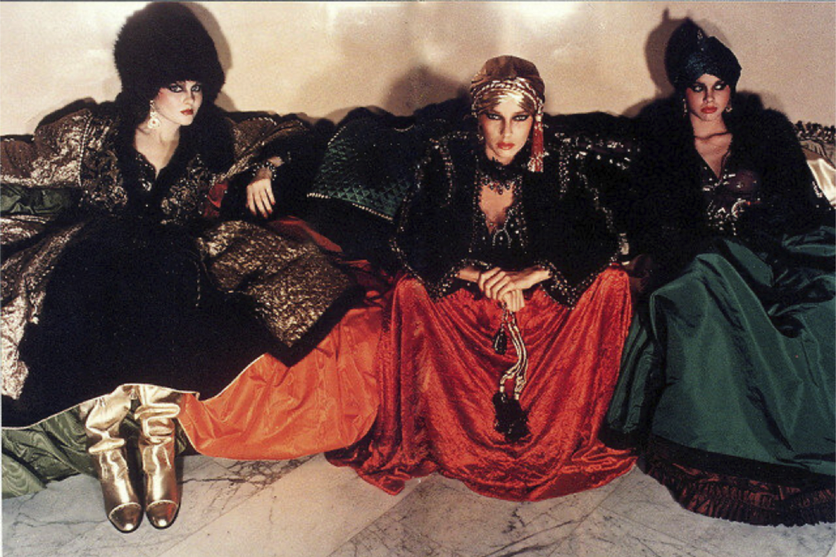 В этой коллекции 1976 года Сен Лоран попробовал переосмыслить богатое наследие России и наполнить его собственным художественным видением, не потеряв самого главного — загадочного и непостижимого характера русской культуры.