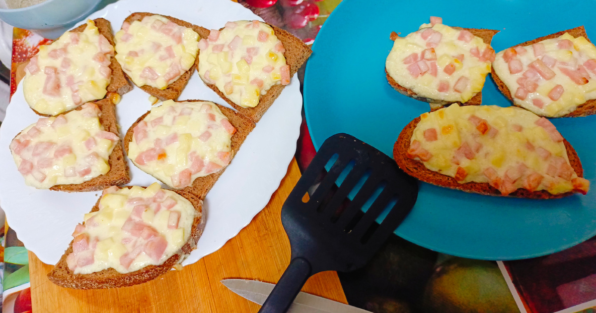 Горячие бутерброды с колбасой, плавленым сырком на хлебе - это отличный вариант быстрого и вкусного перекуса. Колбасу можно использовать абсолютно любую по вкусу.Также можно добавить помидор, у меня с помидором ребёнок не ест делаю без него. Попробуйте! Ингредиенты ▪️Хлеб - 6 кусочков ▪️Колбаса - 100 гр. ▪️Сырок плавленный ломтевой по типу "Дружба" - 1шт. ▪️Майонез - 70-80 гр. ▪️Яйцо куриное - 1 шт. Приготовление: 1.Колбасу и плавленный сырок нарезаем кубиками. 2.К яйцу добавляем майонез и взбиваём вилкой до однородности. 3.Добавляем к яйцу и майонезу нарезанные ингредиенты.Всё перемешиваем. 4.Добавляем к яйцу и майонезу нарезанные ингредиенты. 5.Сверху на хлеб выкладываем приготовленную начинку. 6.Запекаём в разогретой до 200 градусов духовке около 12-15 минут. Приятного аппетита! #бутерброды #бутербродывдуховке #завтрак #перекус