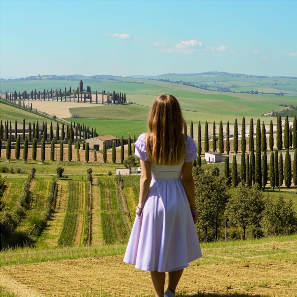 На следующий день Мари и Анна отправились в Тоскану. Поездка на поезде была живописной: за окном мелькали зелёные холмы, покрытые виноградниками и оливковыми рощами. Мари не могла оторвать глаз от этой красоты.