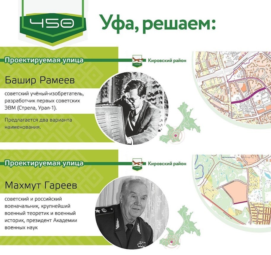 Мэрия Уфы просит горожан проголосовать за название двух новых проектируемых улиц в Кировском районе. Жителям столицы предлагают выбрать один из двух вариантов для улицы, которая появится в активно застраиваемом квартале. Между торговыми центрами «Иремель» и «Ультра» улице предлагают присвоить имя Башира Рамеева или ученого-изобретателя Рамеева. Выразить свое мнение можно здесь https://vk.cc/cAmpF7. В «Цветах Башкирии», рядом с улицей Академика Курчатова может появиться улица генерала Махмута Гареева. Поддержать эту идею можно по ссылке https://vk.cc/cAmqLh. Чтобы проголосовать, нужно зарегистрироваться или авторизоваться на сайте администрации города.