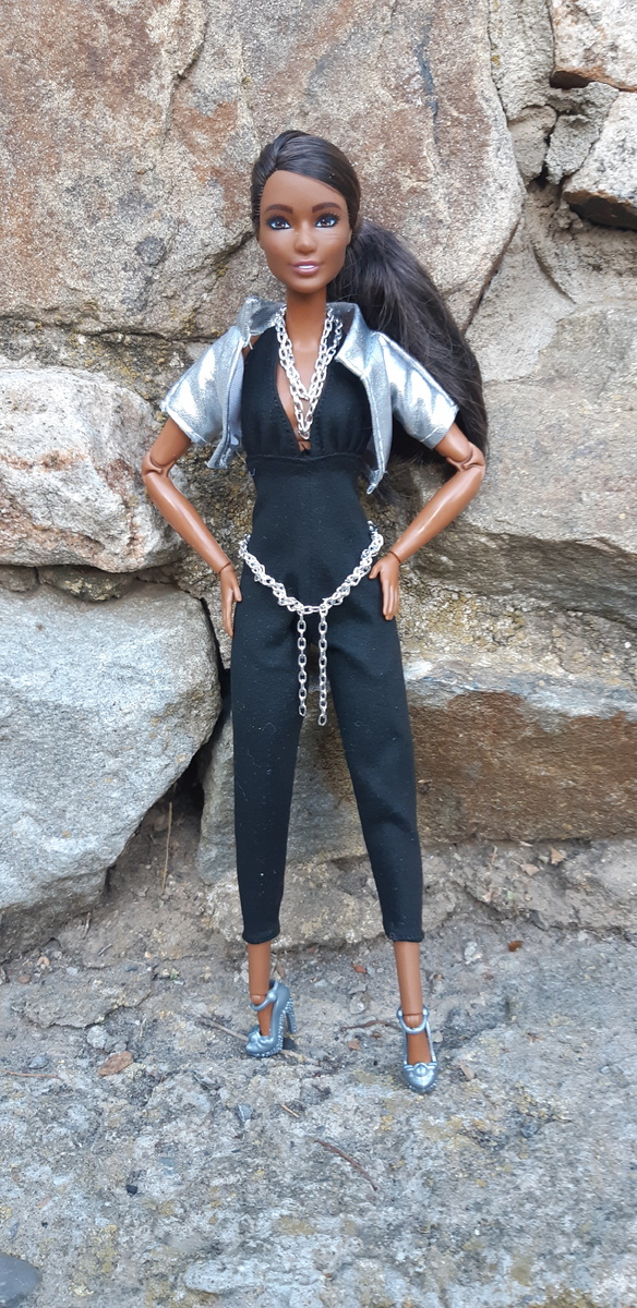 Я так долго тянула с публикацией, потому что ждала задержавшуюся на почте новую голову Юли. Она наконец пришла, и теперь я могу показать вам всех троих. Первой будет Таша в черном комбинезоне с серебрянным болеро. Комбинезон я дополнила цепочкой на шею и пояс. Затем Саша, которая собралась на прогулку. Лента в волосах разделится и превратится в ободок и поясок к этому платью. Так же будет комплект "ободок и пояс" красного цвета, и сооветственно красная сумочка и обувь. И последний наряд, но не купальник(холодно уже), а тоже новое платьице с новыми балетками и очками, покажет Юля. Она на улице фотографиоваться отказалась, потому что ветер, а у нее волосы растрепятся. Поэтому я ее сфотографировала на работе. Вот такие наряды получили мои девочки.