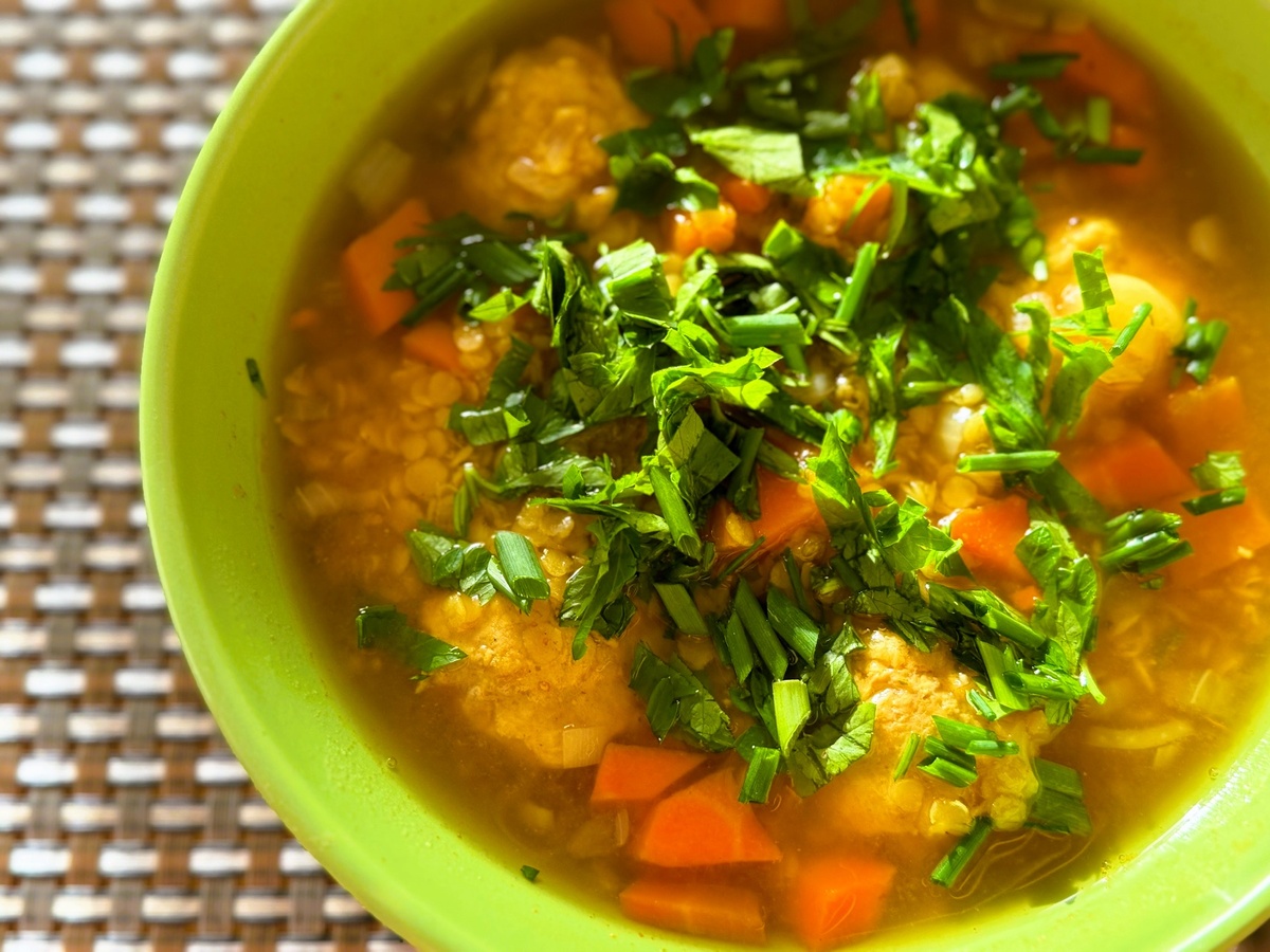 Но я отправила в кипящий бульон овощи, слегка отваренные фрикадельки, и добавила чечевицу. В п