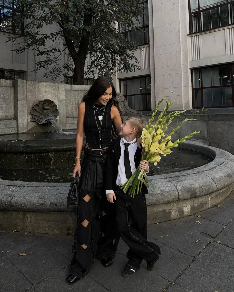 Посмотрела на образы российских знаменитостей с детьми на День Знаний. Удивилась, это не то слово. Не все сразу поймут, в чем тут дело по фото. Но в Москве было +30 в тени! Солнце пекло уже с раннего утра. Такой жары в это время не было где-то 100 лет. Все нормальные дети с родителями пошли в светлых рубашках с коротким рукавом Или просто в рубашках. Без всяких пиджаков-жакетов. Но это нормальные родители. А знаменитости выглядели пугающе. Еще раз. Помните, когда будете рассматривать фото, что жара стоит невыносимая. Может знаменитостей извинит то, что в нашей стране практически нет адекватной нормы официальных нарядов на жару. Мы не готовы к такому. В сентябре у нас обычно холодно. Поэтому они растерялись и надели, либо то что заготовлено было заранее, либо что выпало из шкафа первым. Черный пиджак на ребенке в жару в 30 градусов в тени не уместен 100%. Карина оделась на жару. Может эти прорези для проветривания. Но надевать все черное и готическое очень странный выбор для проводов