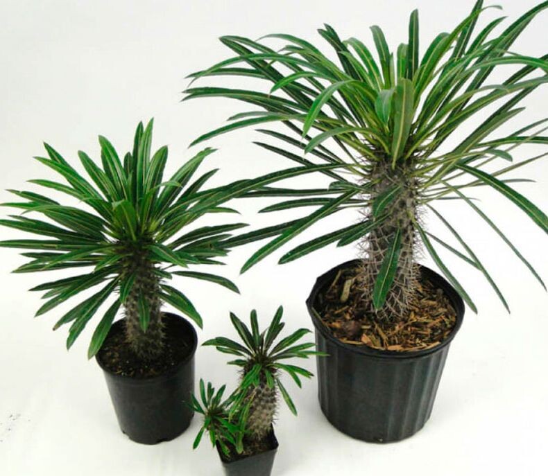 1. Пахиподиум Ламера. Этот вид известен как мадагаскарская пальма. В комнатных условиях может вырасти более метра. Ствол толстый, покрытый бугорками, в центре которых растут шипы. Листья растут только на макушке и образуют плотную розетку. Длина листьев - более 9 сантиметров. Взрослые растения цветут кремовыми цветами с розовым оттенком. 2. Пахиподиум Бревикауле. Карликовый вид. Вырастает менее 10 сантиметров в высоту, при этом ширина стебля достигает 60 сантиметров. По форме стебель напоминает картофелину. Листья зелёные, овальной формы с заострёнными кончиками. Цветёт ярко-жёлтыми цветами на коротких цветоносах. Растёт очень медленно и практически только вширь, поэтому ему требуется широкий и неглубокий горшок. 3. Пахиподиум двухшипный. Характерная особенность вида - почти гладкий каудекс сероватого оттенка. Каудекс (образование на границе стеблевой и корневой части) может вырасти до 60 сантиметров в высоту и более 20 сантиметров в ширину. Из вершины каудекса растут стебли, которые