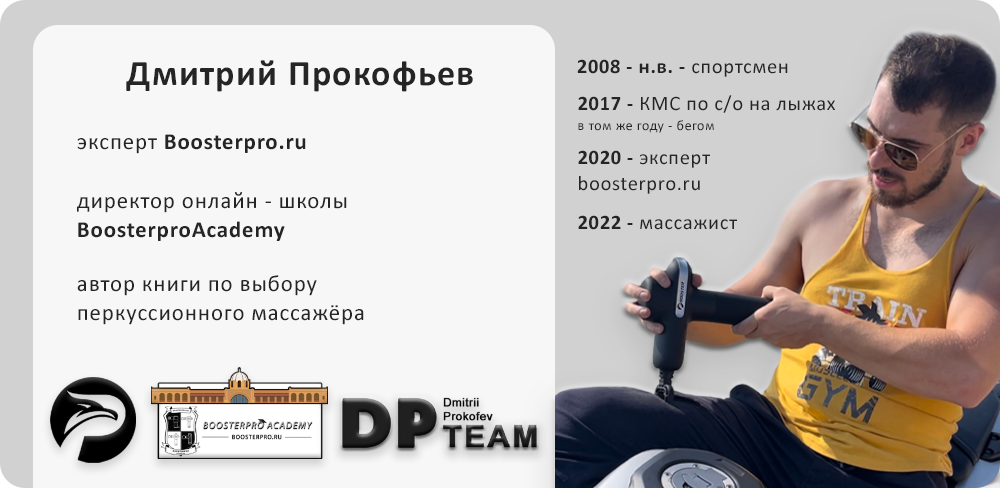 Подготовил статью эксперт по перкуссионным массажёрам, директор бесплатной онлайн школы перкуссионного массажа Boosterpro Academy, действующий спортсмен и массажист Прокофьев Дмитрий.