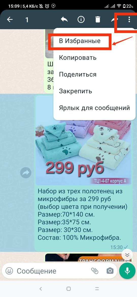 Жмёте на сообщение, которое хотите сохранить, оно выделяется и тогда вверху справа жмёте на три точки, далее в избранные или жмите звёздочку (см.фото ниже) Эти сохраненные сообщения видите только вы, больше никто. Теперь, когда заходите в ватсап , вверху справа жмёте три точки и там есть строка " избранные сообщения" (см.фото ниже) Здесь сохраняются все сообщения, которые вы добавили в избранное. Не важно в каком чате оно изначально находилось. Также можно просматривать сохраненные сообщения в самом чате, соответственно там сохраняются только сообщения того чата, где сохраняете. Чтобы просмотреть эти сообщения жмите на название чата вверху и чуть ниже увидите строку "избранные сообщения" Вот там и будут они. При необходимости, сообщенияиз избранного можно удалить. Для этого зажимаете сообщение, а потом на перечеркную звёздочкуи сообщение удаляется (см.фото выше) 🔶🔷🔶🔷🔶 🛍️ Как сделать заказ смотрите здесь ⬇️ https://dzen.ru/a/ZstLnqAz2gQwf0OC ⚠ Ещё больше товаров и экск
