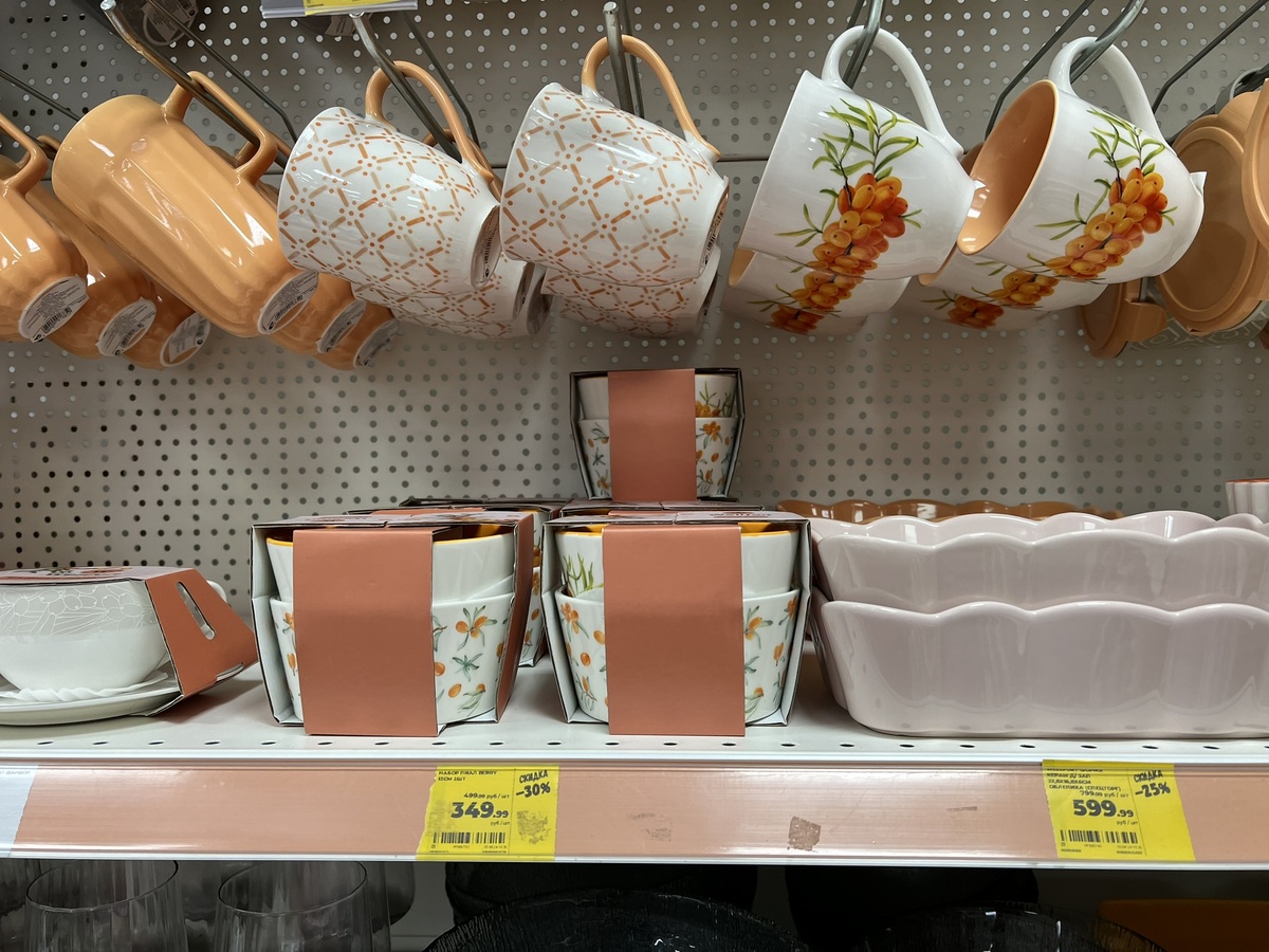Вот это я удачненько зашла! Осень только наступила, а тут уже "осенняя" коллекция подъехала! Осенняя - не значит унылая. Напротив, базовый цвет - теплый оранжевый, солнечный, облепиховый! Ну, и все его сочетания с зеленым, разумеется. Смотрите, красота какая! Роскошно, стильно и неброско. А пиалы - загляденье же! В наборе 2 штуки, так что ценник - вполне себе норм. Контейнеры для сыпучих - в той же осенней цветовой гамме. Чашки. Особенно понравились чайные пары - лаконичные, как будто совсем без рисунка, а приглядишься - узор есть. Тех, кому выраженная геометрия нравится, вот к таким тарелкам рекомендую присмотреться. Растительный орнамент, цвета - насыщенный зеленый и черный. Причем тут тоже скидки в 50%. Зачетно! Кстати, и просто кружки чудо как хороши! Это, видимо остатки былой роскоши - то есть прежних коллекций. Белые - очень красивой формы, вот только позолота сверху смущает: будет ли практично и не сотрется ли в посудомойке? Ну, да вечного ничего нет. Да и не надо! Ведь куда