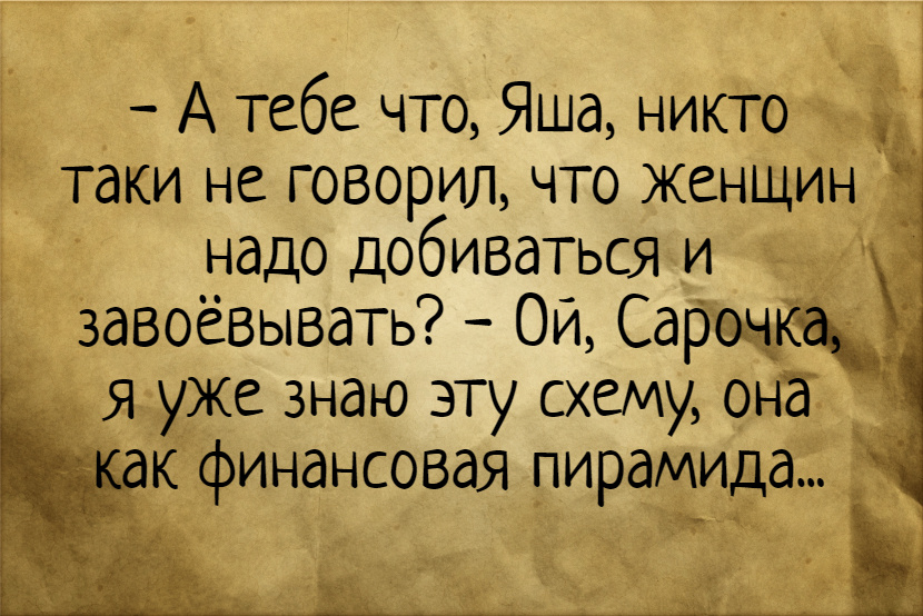 Абрам прогуливается с Сарой по Одессе. Проходят мимо ресторана. Сара говорит: -Ой, как вкусно пахнет! -Тебе понравилось? Хочешь, ещё раз пройдем? Интеллигентная одесская семья. Вечер. Жена третий час играет на виолончели. Муж, отрываясь от журнала: - Ну, Лилечка, перестань! Купим мы тебе эти итальянские сапоги! Одесская аптека. - Абрам Моисеевич! У Вас, случайно, нет перманганата калия? - Нет, Израиль Маркович! Но есть очень свежий цианистый калий... - И это существенная разница? - Ой, не смешите меня! Всего 20 копеек! Встречаются две одесситки. - Розочка, иду я вчера ночью по Греческой. Вдруг вижу впереди огромный мужской силуэт! Я сразу бежать! - Ну и что? Таки догнала? Продавец - Софе: - Берите, берите эту шляпку. Это последний крик моды. - Предпоследний - говорит Софа. - Не понял. - Последний будет у мужа, когда он узнает, сколько она стоит. Мара на Привозе долго выбирает шляпку. Продавщица не выдерживает: - Мадам, если бы ваш муж выбирал себе жену так же тщательно, как вы шляпк