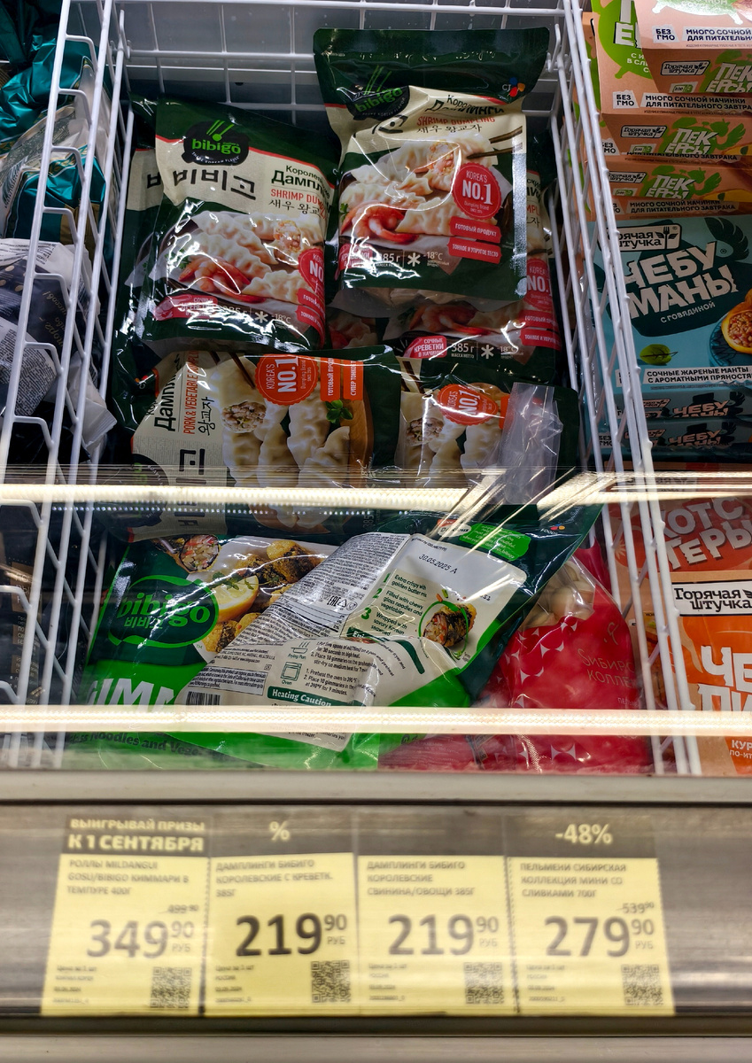 Всем привет! "— Это что такое?! — Пельмени! — Но это ж равиоли! — Но это пельмени! — Да, но все-таки это равиоли! — Но сначала то они пельмени, а уж затем всё остальное! Ну это ж пельмени, Михалыч!" Вспомнился фрагмент из всем известного фильма). Давно хотел попробовать эти чудо-пельмени. Но это королевские дамплинги, да ещё и с креветками. Без акции они стоят необоснованно дорого, но я дождался более менее адекватной цены. 220 рублей за 385 граммов. Получается около 500р за кг. Хотя обычные пельмени можно купить дешевле. И, кстати, "дамплинги" переводятся как пельмени. Но назвав обычные пельмени королевскими дамплингами и добавив пару корейских символов можно задрать цену ещё выше. Всё как обычно короче). Продукт бренда "Бибиго". Изготовитель: ООО "Сиддей Равиолло Рус", г. Санкт-Петербург. "Ну это ж равиоли" Если не обращать внимания на состав, то по картинке на пачке кажется что эти пельмени с креветочной начинкой. В действительности это не так. Креветки тут на третьем ме