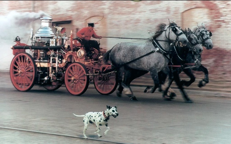 В большинстве случаев в наши дни далматины выполняют роль четвероногих любимцев, приносящих радость и хорошее настроение в каждый дом. Но так было не всегда. Когда-то эти сильные, смелые и выносливые собаки верно служили пожарным и помогали им спасать людей. И вот каким образом. Одна из основных легенд гласит, что далматины стали «пожарными» из-за врождённой глухоты некоторых особей. Проблемы со слухом оказались очень кстати: они позволяли собакам не пугаться громких сирен. Отчасти это правда – далматины иногда действительно могут быть слабослышащими. Однако не по этой причине они стали обитать в пожарных частях. На самом деле, столетие назад пожарные выезжали на вызов на конных повозках, в которых находились сами пожарные, вода, насосы и другое оборудование. Когда карета летела на борьбу с огнём, времени разгонять людей с улицы практически не было. Из-за этого особенно многолюдные участки заставляли пожарных замедляться и даже останавливаться. Для того, чтобы таких ситуаций не происхо