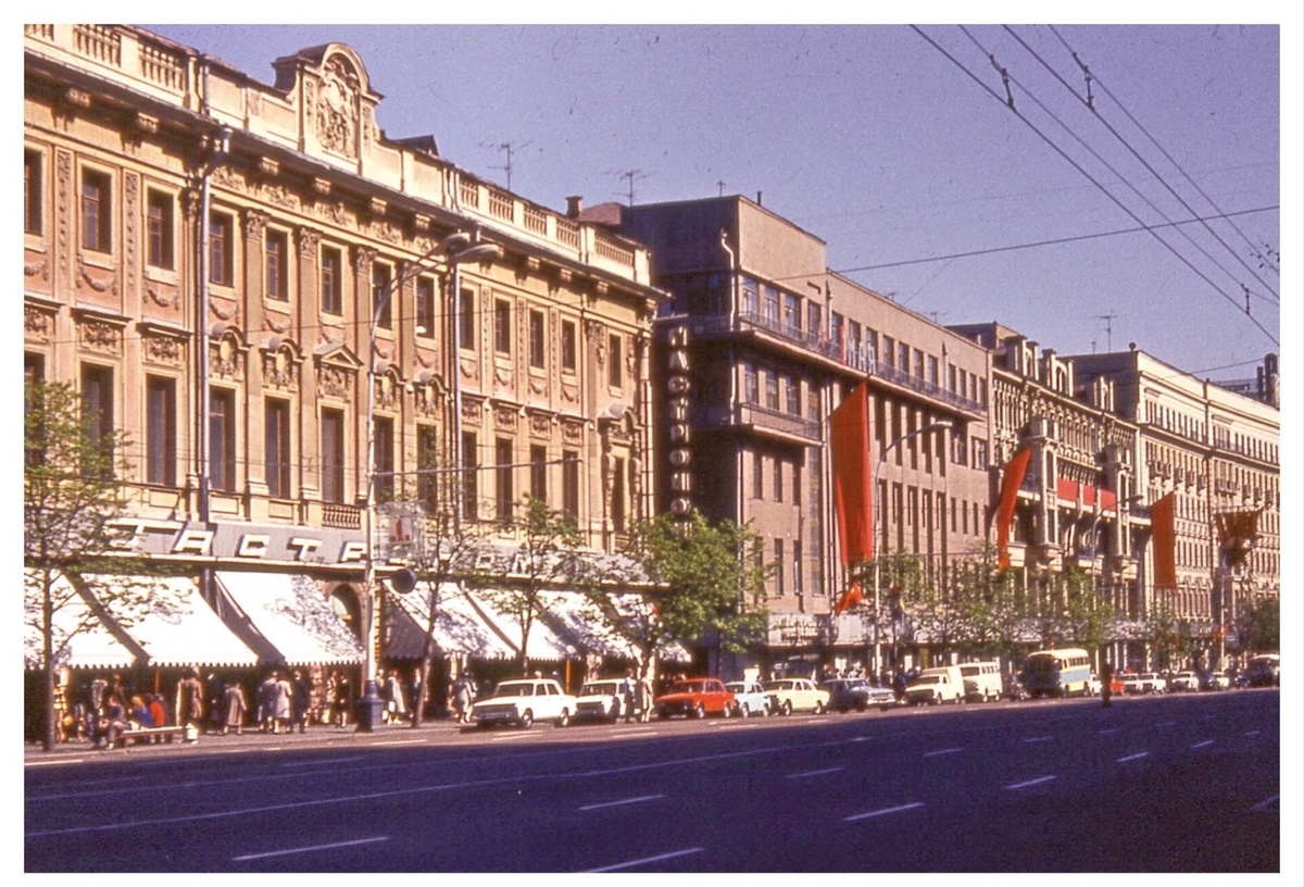 Приветствую вас, друзья! Продолжаем наши путешествия сквозь время по волнам нашей памяти, сегодня вспомним семидесятые прошлого столетия. Поехали! ..... Улица Горького, вид от Пушкинской площади. Слева знамениты Елисеевский гастроном, который тогда привлекал большое количество покупателей не только своим расширенным ассортиментом, но и прекрасно сохранившимися историческими интерьерами. Сама же улица украшена к празднованию очередного праздника весны и труда. Фото 1975 года, Михаил Александров Елисеевский Сейчас это улица Тверская, ей вернули дореволюционное название в начале девяностых годов. В 2015 году улицу комплексно благоустроили, но на этом участке деревьев теперь заметно меньше, чем было в семидесятых годах. А вот Елисеевский несколько лет назад закрыли и его дальнейшая судьба до конца пока непонятна. Кстати, справа исчезла гостиница, её начали реконструировать, да так и забросили это дело лет десять назад. В семидесятых в здании работала знаменитая Филипповская булочная Тепер
