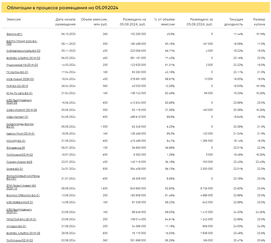 5 сентября новых размещений не было. Суммарный объем торгов в основном режиме по 446 выпускам составил 1040,3 млн рублей, средневзвешенная доходность — 18,94%. 📊 Подробнее в ВДОграфе Больше актуальных новостей читайте оперативно в нашем телеграм-канале