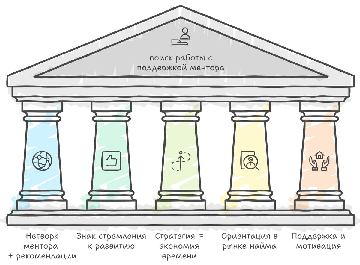 Кроме стандартной помощи в создании резюме, подготовке и прохождению собеседований, ментор может оказать следующую поддержку: Ментор открывает доступ к скрытым вакансиям и помогает наладить контакты с профессионалами в вашей области, что увеличивает шансы на успешное трудоустройство. Например, я даю рекомендации рекрутерам и коллегам, делаю посты о своих менти в сообществах. Ментор, обладая опытом и авторитетом в своей области, может предоставить рекомендательное письмо или напрямую порекомендовать его работодателям, что значительно повышает доверие к соискателю. Указание сотрудничества с ментором в резюме или на собеседовании демонстрирует стремление кандидата к профессиональному росту и развитию, а также его готовность инвестировать время и усилия в совершенствование своих навыков. Ментор помогает вам найти наиболее эффективный путь к трудоустройству, экономя ваше время и силы. Вместо того чтобы тратить время на самостоятельные пробы и ошибки, вы получаете проверенные рекомендации. О