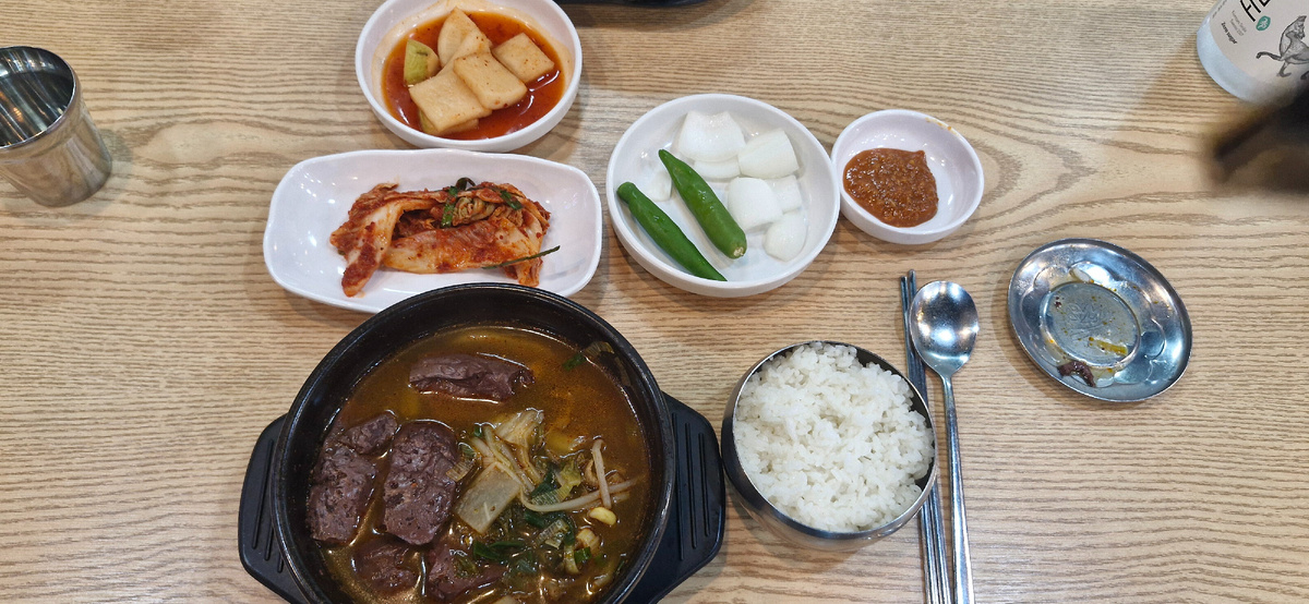 Ещё одно традиционное корейское блюдо, которое собирает диаметрально противоположные отзывы у гостей Кореи. Горячий и острый как огонь, наваристый и густой суп - традиционное ... летнее блюдо. Да, именно в пик жаркого, душного и влажного до предела корейского лета принято угощаться этим супчиком. Все как древний китайский доктор прописал - жаркая погода требует не менее жаркой еды. Очень горячий, жарко острый - он гарантированно сбалансирует вашу внутреннюю энергию, придаст сил и поможет выжить и пережить корейское тропическое августовское лето. Но конечно никто не запрещает есть его весь год. В любую погоду в любое время года. И зимой он способен подарить внутренний жар и согреет не хуже летнего солнышка. Простая и домашняя подача характерна для традиционной кухни Кореи. Это еда не для туристов. Хотя знатоки и любители с удовольствием обнаружат неброскую вывеску небольшого ресторанчика. Главный ингредиент супа, как не сложно догадаться, говяжья кровь. Это корейская интерпретация кит