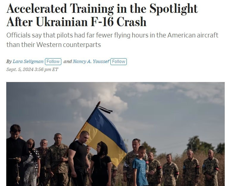 Wall Street Journal вновь возвращается к теме потери Украиной переданного ей . в конце августа истребителя F-16. Ссылаясь на мнение источников в среде американских официалов, издание возлагает вину за случившееся на поспещное решение об использовании самолета бою спустя всего несколько недель после их получения. Американские чиновники считают, что некоторые украинские летчики провалили программу обучения, и не имели достаточно опыта для боевых вылетов. Кроме того, перед крушением истребителя датские инструкторы выражали сомнения в способности некоторых пилотов летать самостоятельно. По словам представителя Пентагона, пока планов по корректировке программы подготовки украинских пилотов пока нет, но «катастрофа показала, что происходит, когда пытаешься торопить события», поделился с изданием своими соображениями один из собеседников, занимающий высокий пост в Пентагоне. Погибший украинский пилот Алексей Мес с позывным Moonfish («Рыба-Луна»), не был одним из тех, насчет кого тревожились и