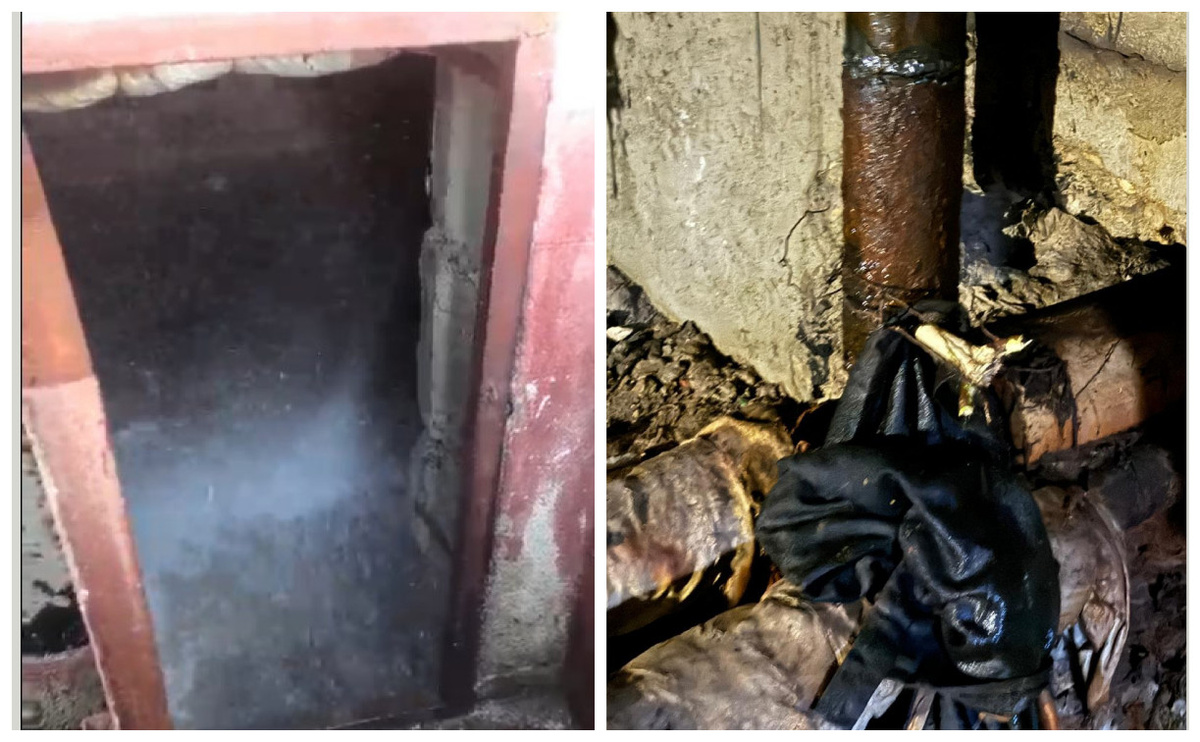 Коммунальщики «починили» лопнувшую трубу в подвале на ул. Серебровской деревянным бруском и тряпкой